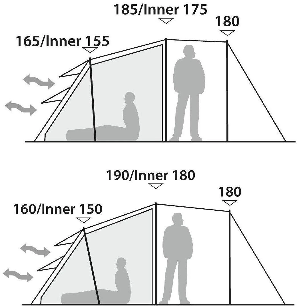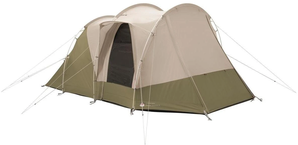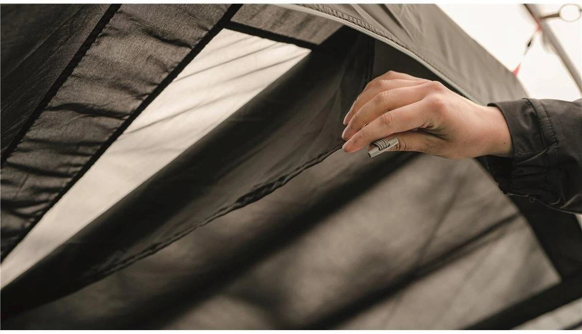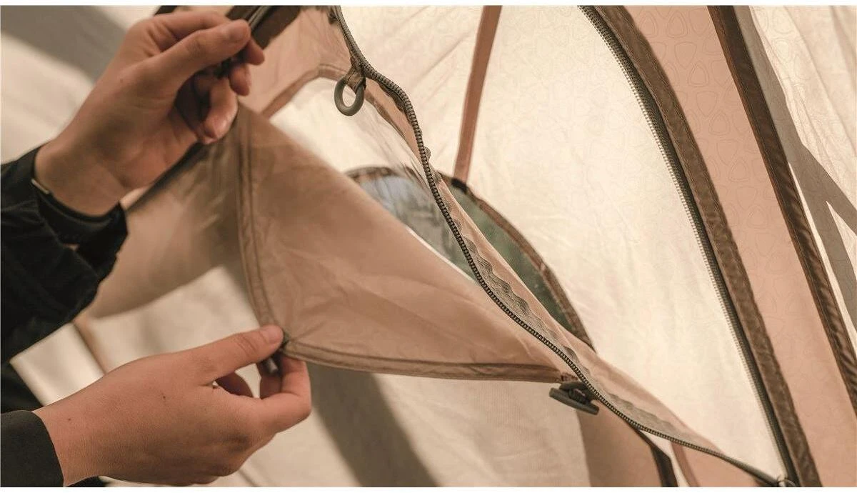 Das Double Dreamer ist perfekt für Abenteurer, die sich in ihrem Basislager Komfort, volle Stehhöhe und Schutz bei jedem Wetter wünschen. Zu den Ausstattungsmerkmalen gehört ein regengeschützter Seiteneingang für einen trockenen Zugang zum Zelt. Über die beiden hinteren und die niedrig angeordneten Lüftungsöffnungen wird die Luftzufuhr reguliert. Unterstützt wird dies durch die Netzeinsätze hinter den Außentüren, die beim Lüften Insekten fernhalten. Das Fenster mit Netzeinsatz ist mit einem wasserdichten Vorhang versehen, der per Reißverschluss befestigt wird. Das obere PVC-Panel hilft dabei, Privatsphäre, Belüftung und Licht perfekt abzustimmen.